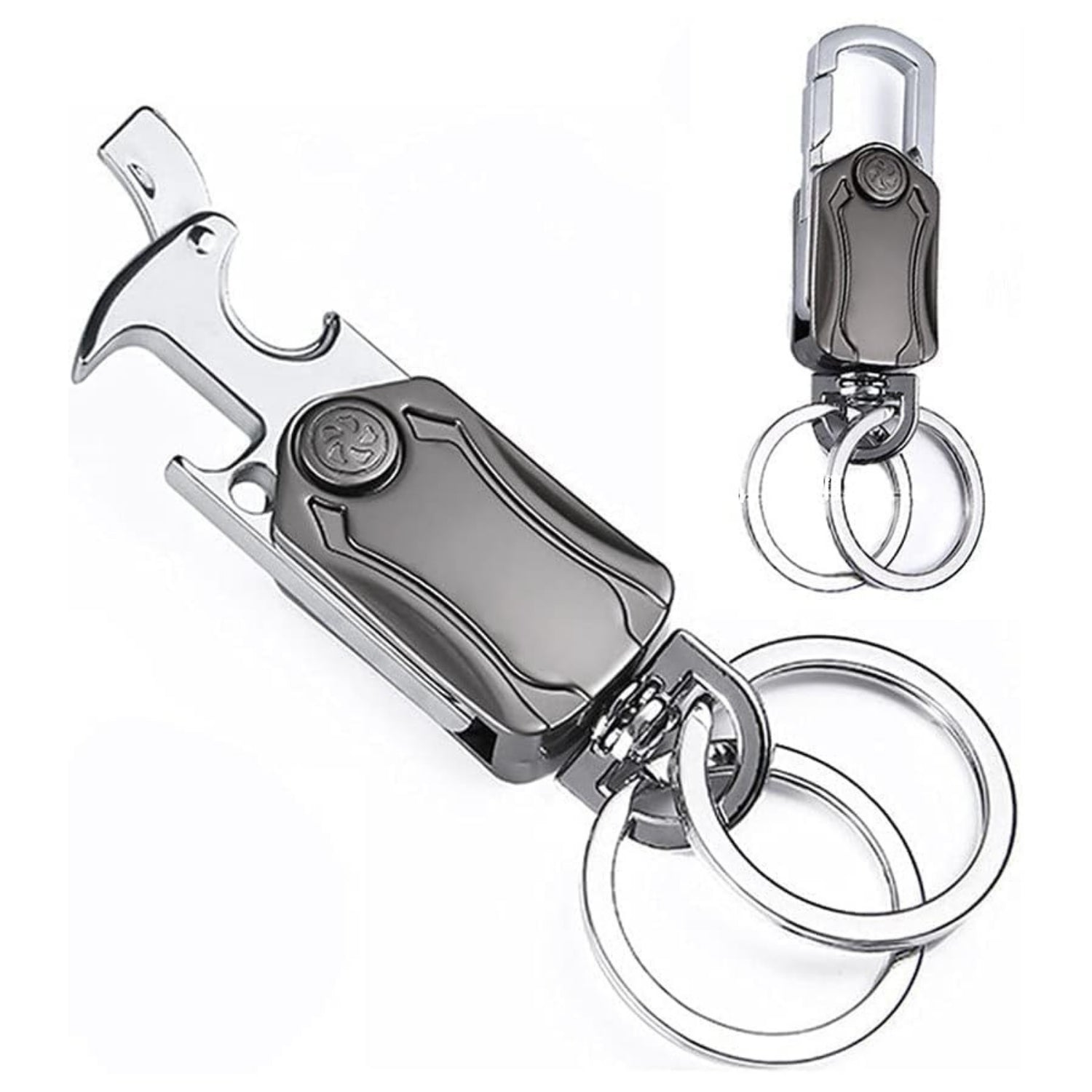 - 🔑 5-in-1 Multifunction Keychain – Bottle opener, cutter, phone holder, 360° spinner & carabiner clip.